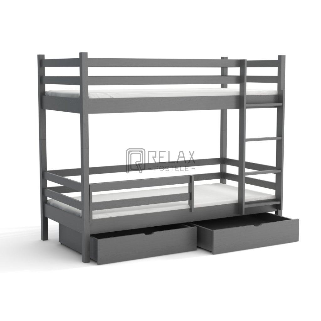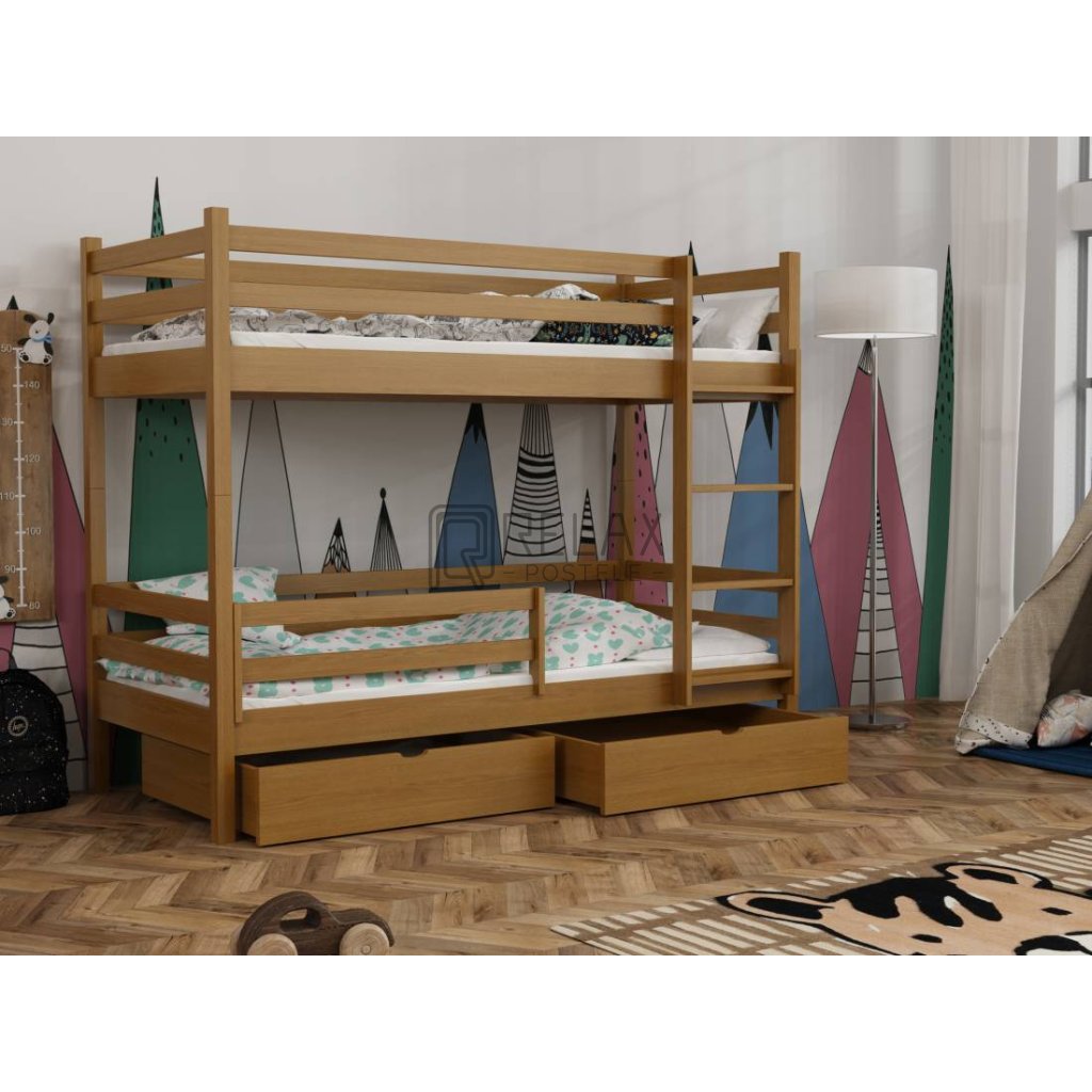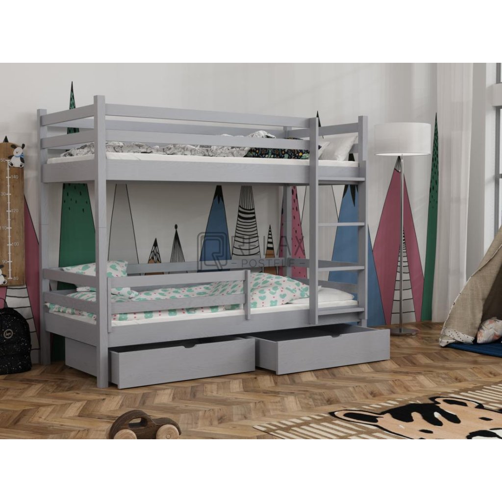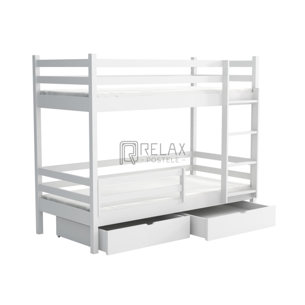 Nosnost postele je 90 kg na každé lůžko, což zaručuje pevnost i při každodenním používání. Součástí jsou laťkové rošty a dva prostorné šuplíky na kolečkách. Spodní přední zábranu lze dokoupit. Postel je dodávána bez matrací – s výběrem vám rádi pomůžeme.