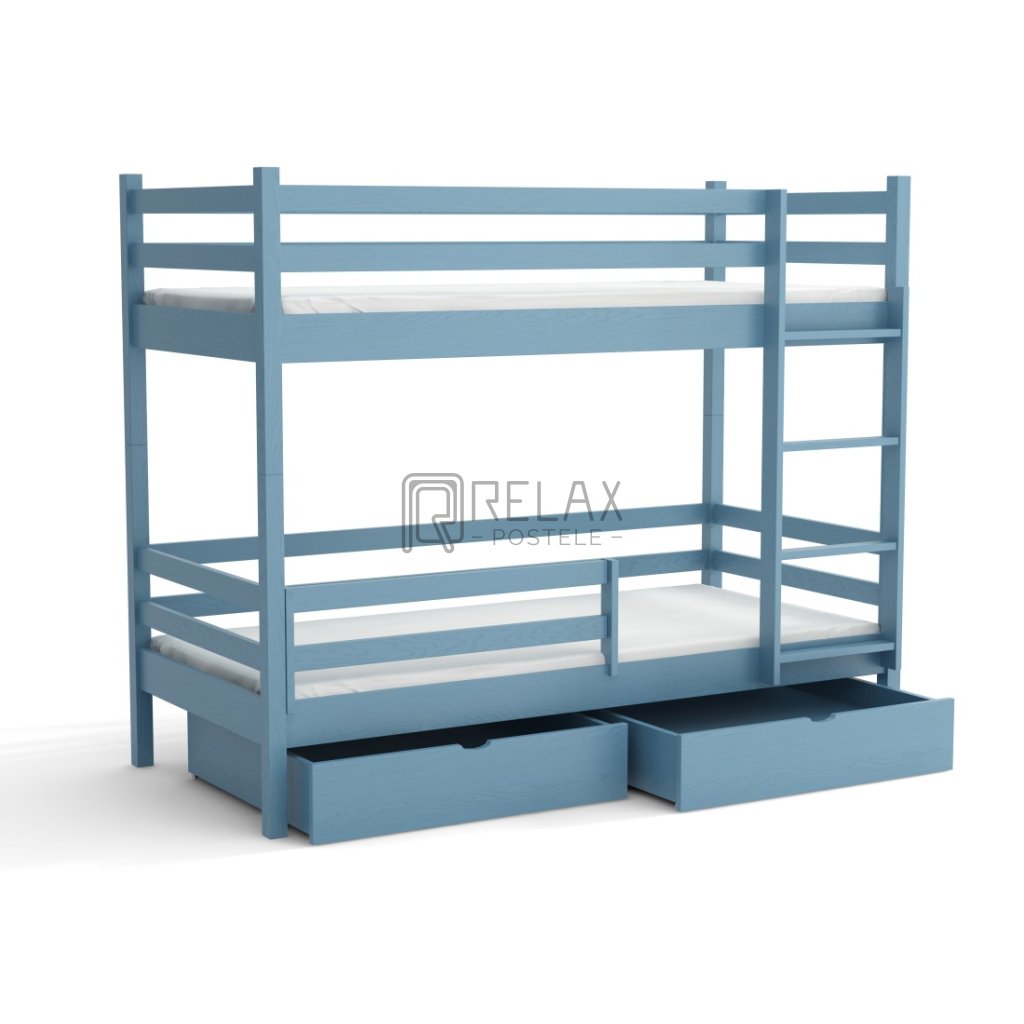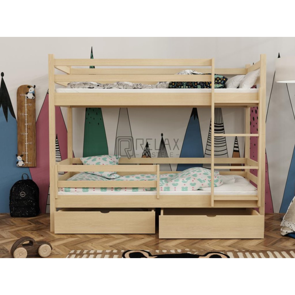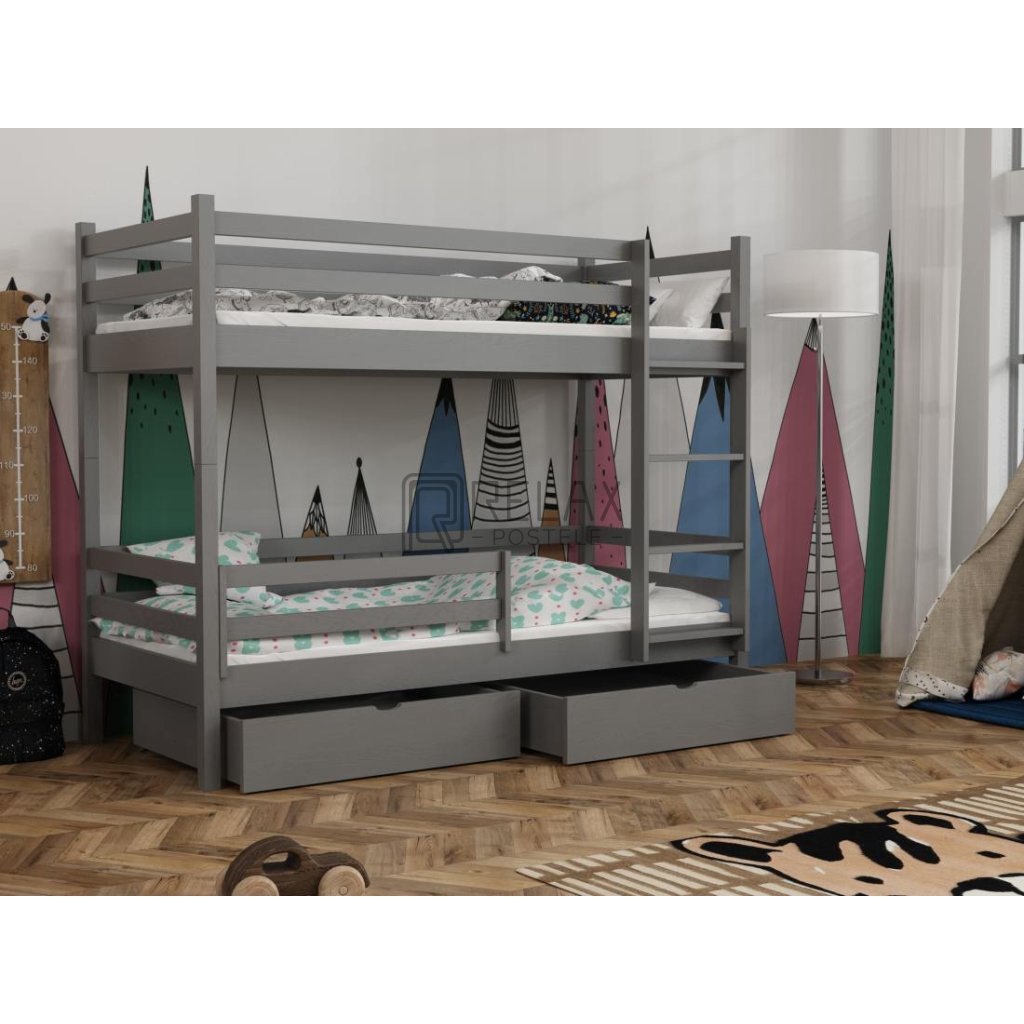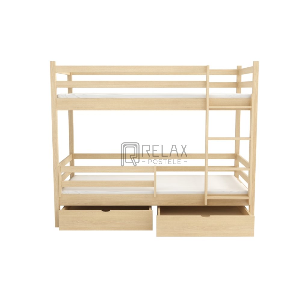 Nosnost postele je 90 kg na každé lůžko, což zaručuje pevnost i při každodenním používání. Součástí jsou laťkové rošty a dva prostorné šuplíky na kolečkách. Spodní přední zábranu lze dokoupit. Postel je dodávána bez matrací – s výběrem vám rádi pomůžeme.