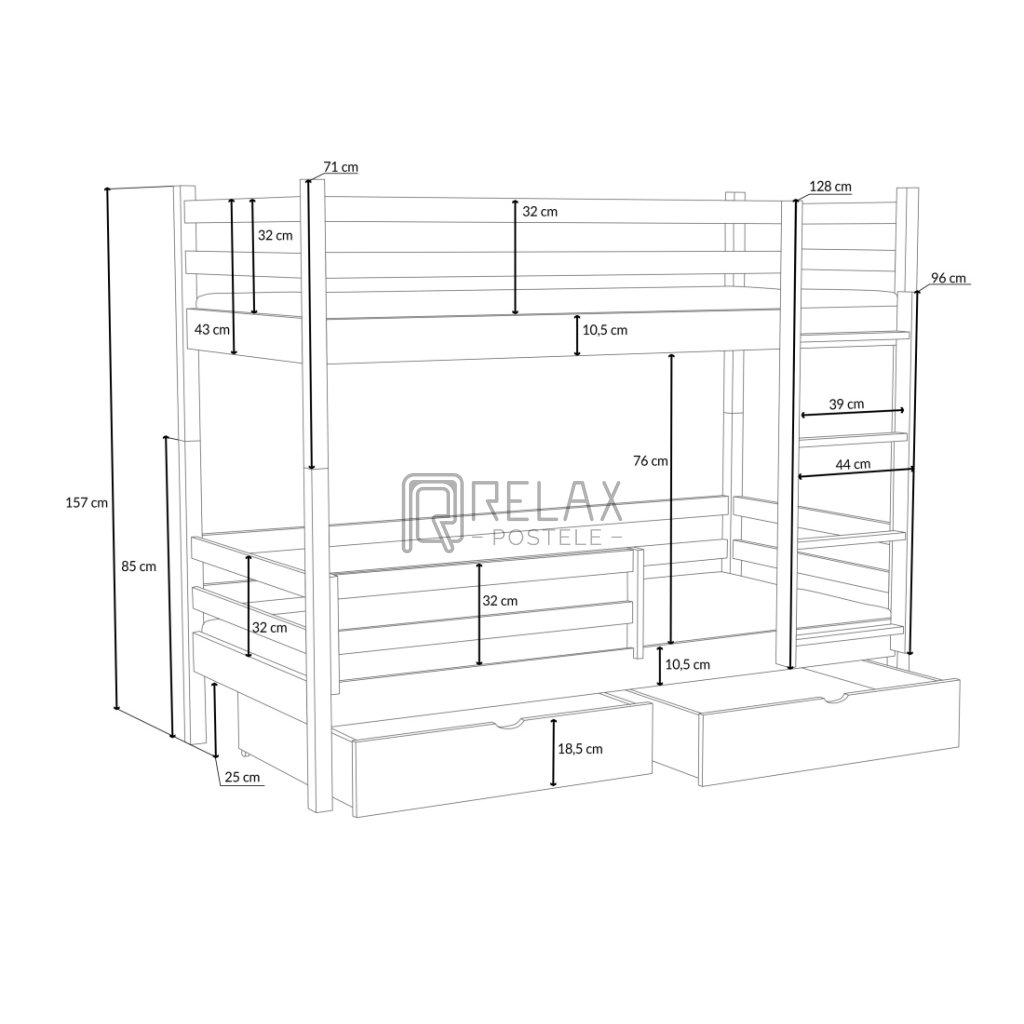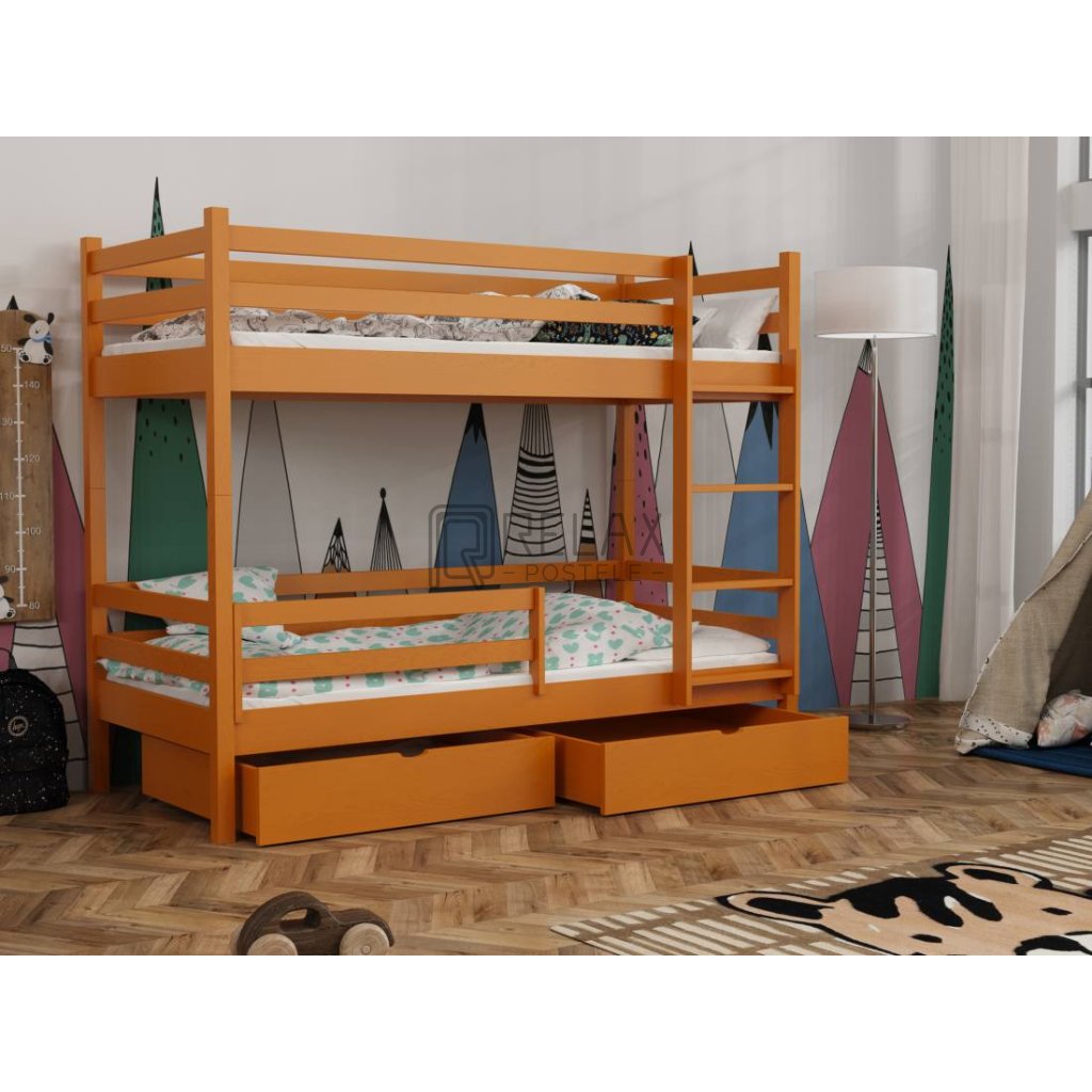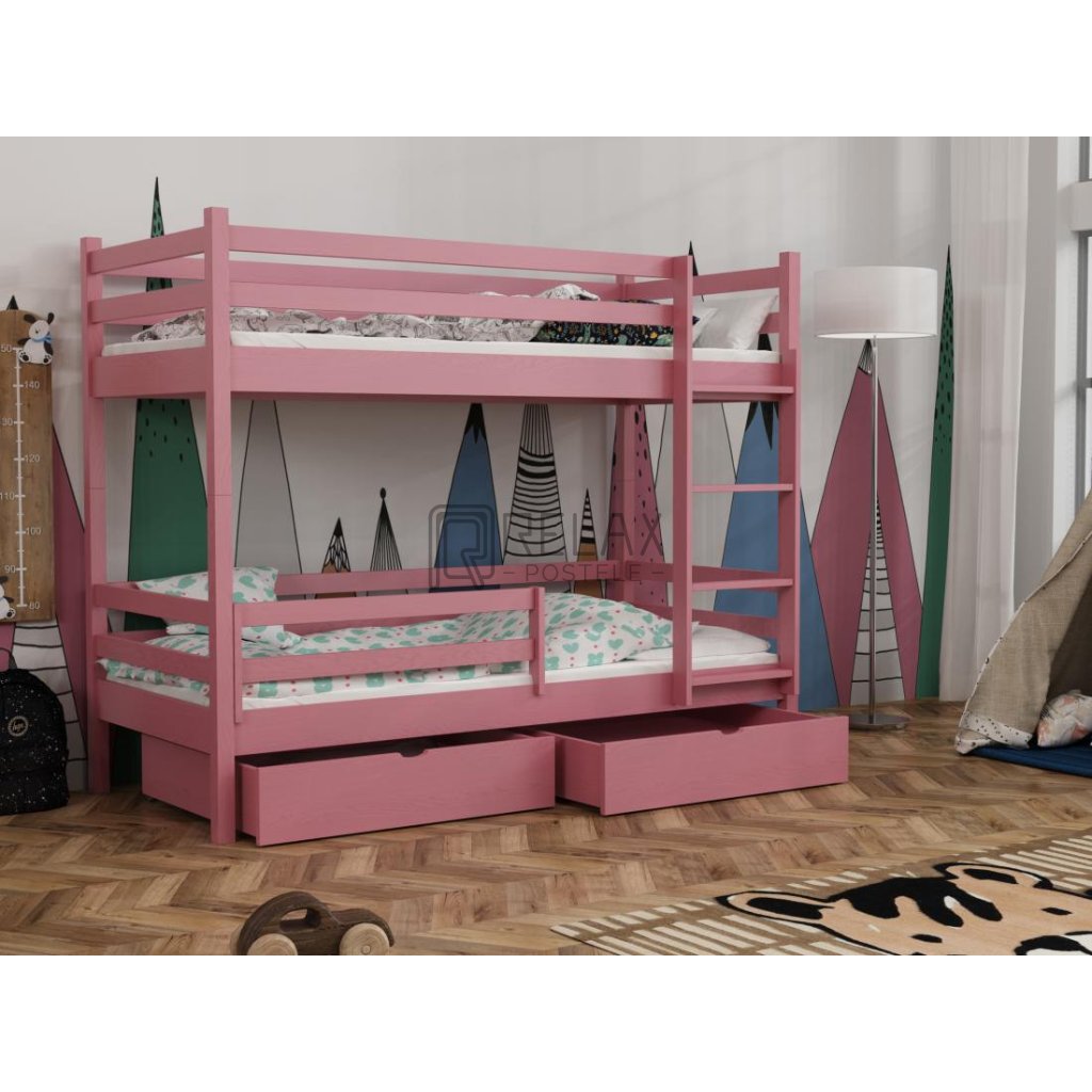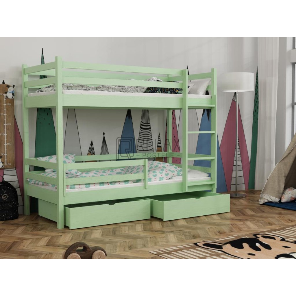 Nosnost postele je 90 kg na každé lůžko, což zaručuje pevnost i při každodenním používání. Součástí jsou laťkové rošty a dva prostorné šuplíky na kolečkách. Spodní přední zábranu lze dokoupit. Postel je dodávána bez matrací – s výběrem vám rádi pomůžeme.