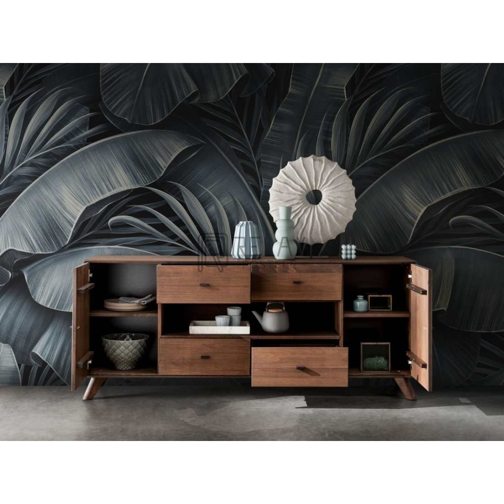 Komoda se vyznačuje frézovanými dvířky s jednou policí uvnitř. Je doplněn čtyřmi praktickými zásuvkami a otevřenou policí.