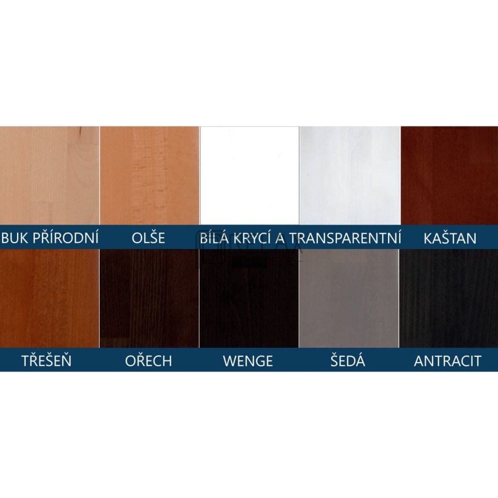 | Barva: | Buk přírodní, Antracit, Bílá krycí barva, Bílá transparentní, Kaštan, Olše, Ořech, Šedá, Třešeň, Wenge |