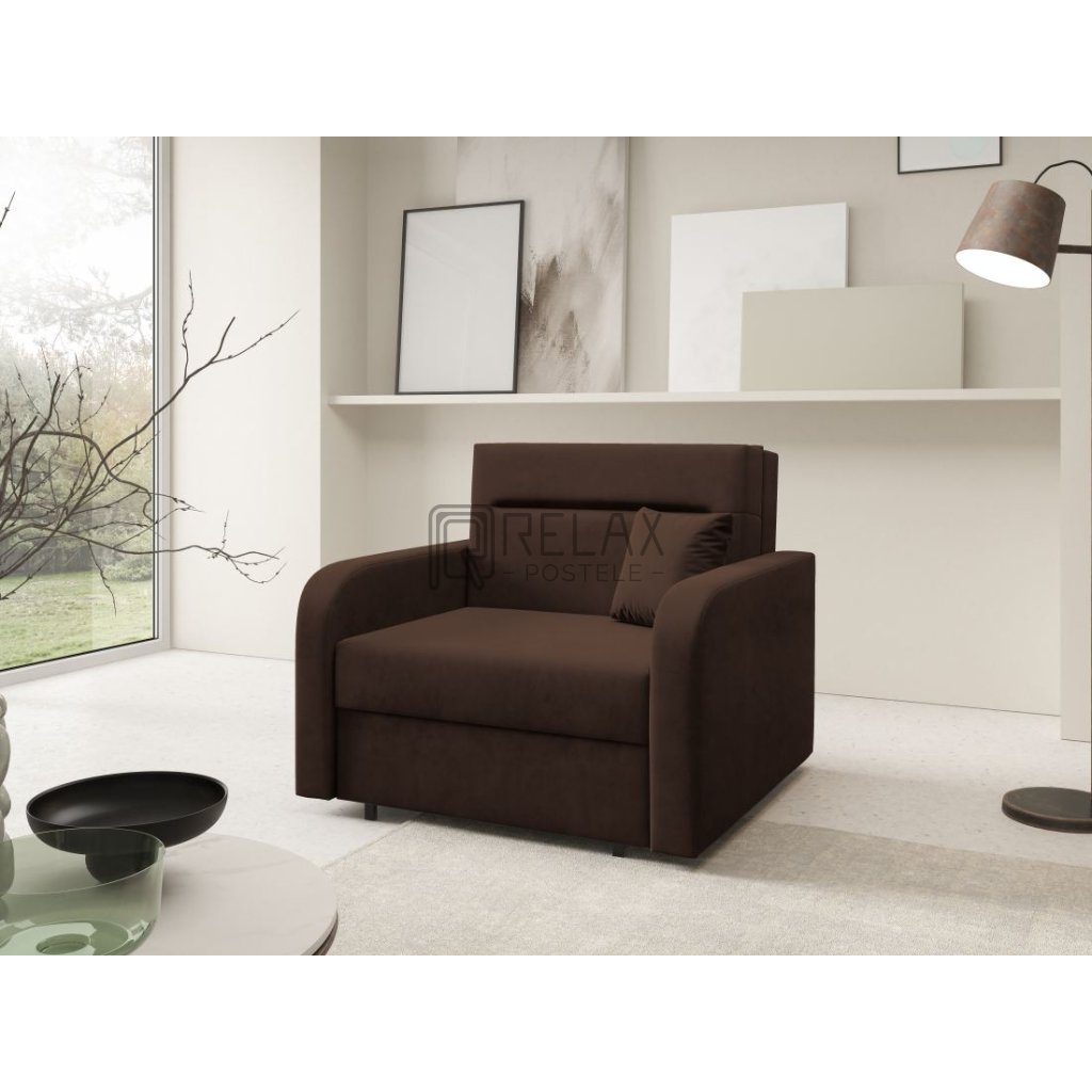 Praktické rozkládací křeslo Hela 1 v hnědé barvě s kvalitním velurovým potahem nabízí nejen pohodlné sezení, ale i možnost rychlého rozložení na lůžko o rozměrech 196x80 cm. Úložný prostor na lůžkoviny je ideální pro malé prostory, kde potřebujete maximálně využít každý centimetr. Nosnost křesla je 125 kg, robustní konstrukce a čalouněná zadní strana umožňují volné umístění do prostoru, kamkoliv v interiéru.