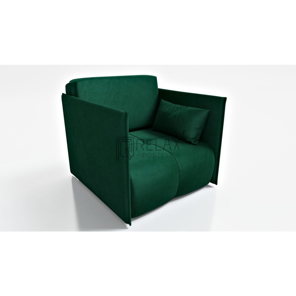Rozkládací křeslo v elegantní zelené látce přináší do interiéru nejen výrazný design, ale i vysoký komfort. Hlavní výhodou je snadné rozkládání na lůžko o rozměru 80x195 cm, což umožňuje rychle připravit pohodlné místo na příležitostné přespání. Křeslo má praktický úložný prostor na lůžkoviny, nosnost 110 kg a čalouněná zadní strana umožňuje volné umístění v prostoru.