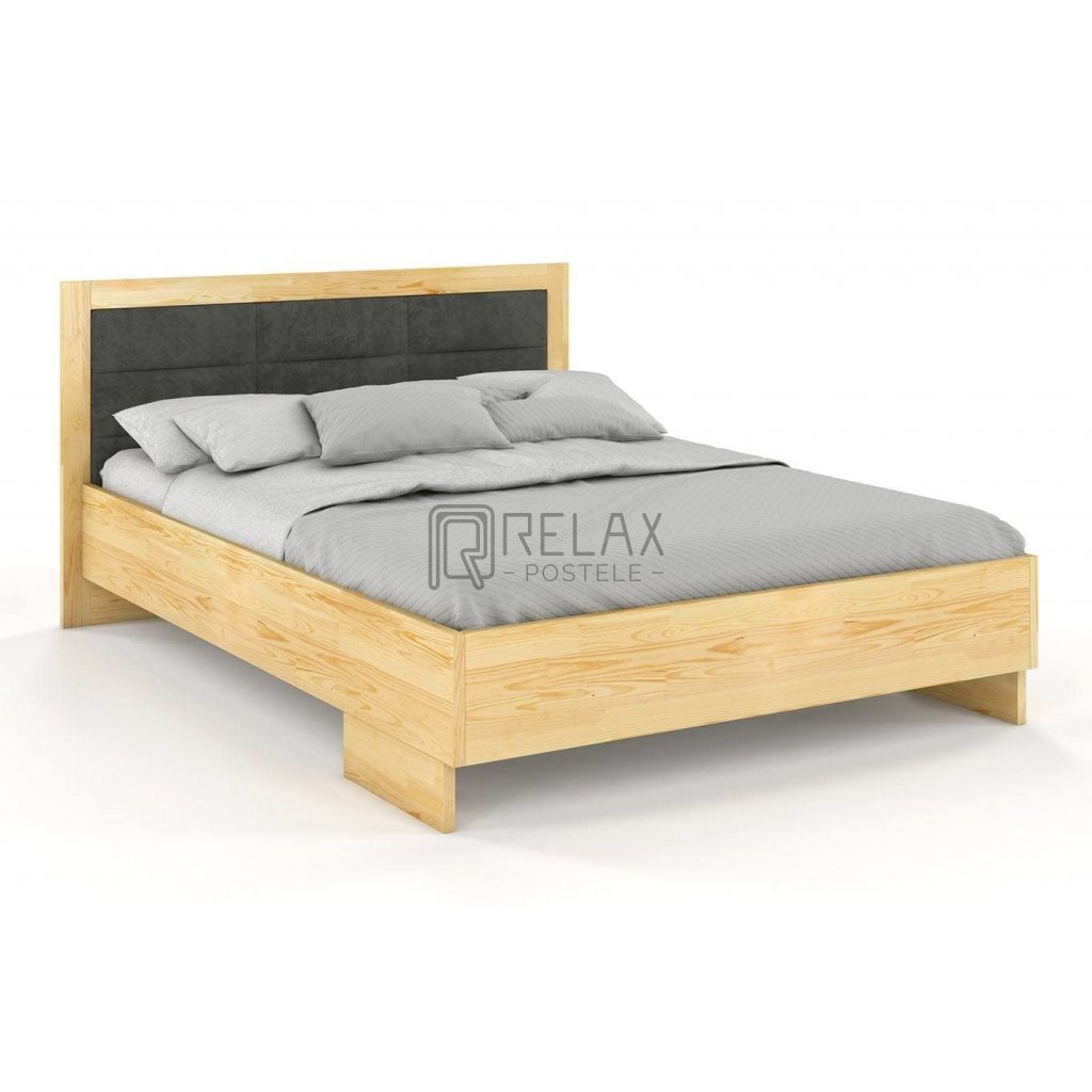 Moderní desingová manželská zvýšená postel z masivu borovice s čalouněným zadním čelem.