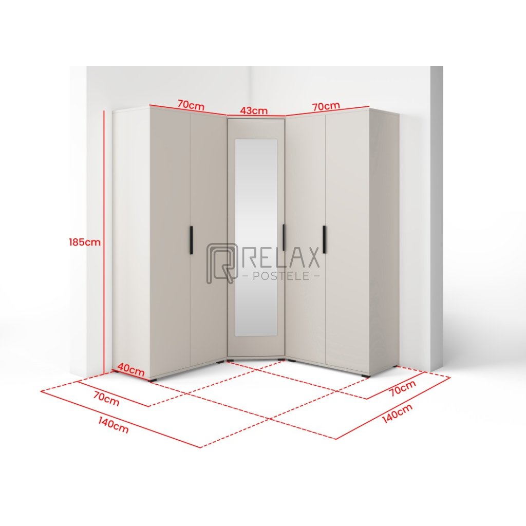 Rohová skříň je navržena tak, aby efektivně využila roh místnosti a nabídla praktický úložný prostor bez zbytečného zabírání plochy. Skříň se zrcadlem kombinuje police a prostor pro zavěšení oblečení – v rohové části najdete dvě šatní tyče a čtyři police. Boční skříně jsou vybaveny jednou policí a výsuvným věšákem na ramínka. Do těchto bočních částí je možné dokoupit další police a přizpůsobit si tak vnitřní uspořádání podle vlastních potřeb.