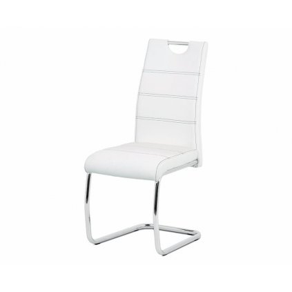 Atraktivní židle bude ozdobou každé jídelny či kuchyně. Provedení koženka v bílé barvě s dekorativním prošitím v kombinaci s pochromovaným madlem a podnoží.